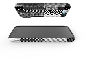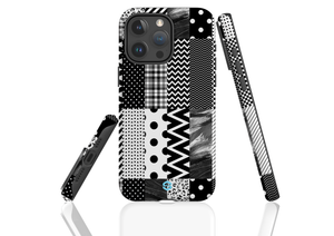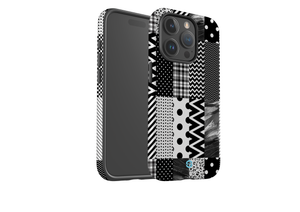 Step into chic sophistication with the Noir Patchwork Phone Case, crafted for the iPhone 15 series. This striking design showcases an intricate arrangement of black and white blocks, featuring a playful mix of polka dots, stripes, and other patterns. The contrasting elements come together to create a bold, geometric look that stands out while staying true to a timeless monochromatic palette.